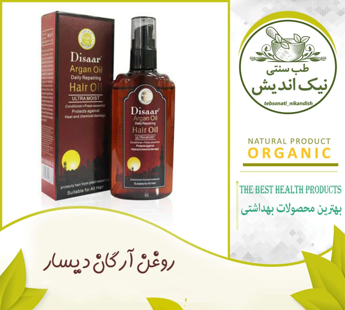روغن آرگان دیسار Disaar حاوی پروتئین ها و ویتامین های غنی برای بهبود موهای خشک یا ضعیف است. همچنین به ترمیم و مرطوب سازی موهای شکننده و آسیب دیده کمک می کند. این روغن یک محیط مغذی و راحت برای رشد موهای شما ایجاد می کند و باعث می شود موها نرم و براق شود.