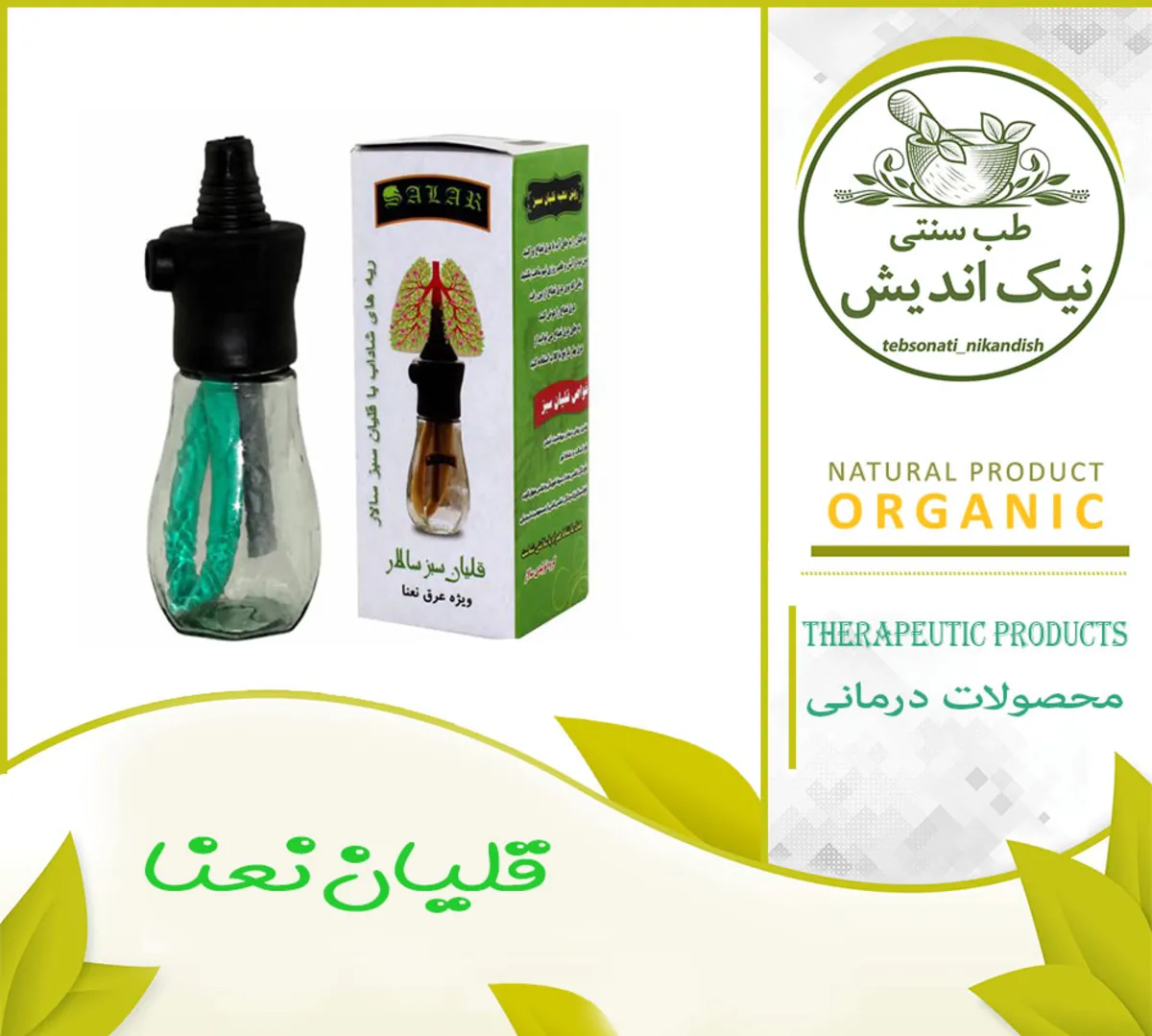 قلیان عرق نعنا معروف به قلیان سبز تولید شده توسط گروه تولیدی سالار، یک کالای بی نظیر برای درمان مشکلات ریوی و تنگی نفس است. این کالا با وزن 260 گرم بسیار سبک و قابل حمل در جیب و یک کالای مسافرتی می باشد که به راحتی می توانید از آن در سفر هم استفاده کنید. افرادی که به بیماری آسم دچار شده اند و هم چنین ورزشکارانی که میخواهند اکسیژن بیشتری به داخل شش هایشان وارد شود، بهتر است روزی 5 الی 20 دقیقه عرق نعنا را به روش قلیان بخور دهند.